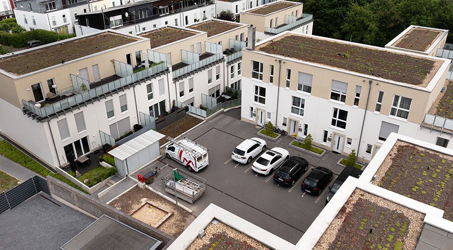 In Rösrath bei Köln sind 12 Einfamilienreihenhäuser (ab ca. 150 m²), zwei Doppelhäuser (ab ca. 160 m²) sowie ein Mehrfamilienhaus mit 7 Wohnungen (ca. 45—140 m²) als Projekt der baucon entstanden. Alle Wohngebäude sind von einer grünen Parkanlage umgeben.