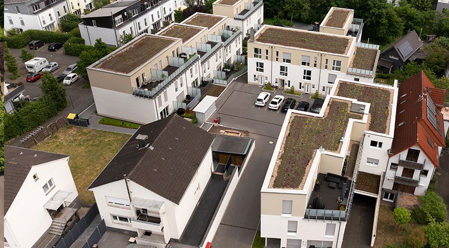 Das neue Quartier fügt sich harmonisch in die bergische Landschaft ein. Um das Nord-Süd-Gefälle von gut sechs Metern zu überwinden, wurden die Gebäude stufenförmig versetzt angeordnet. Die Zugänge zu den Häusern sind barrierefrei, das Mehrfamilienhaus ist mit einem Aufzug ausgestattet. Begrünte Flachdächer, eine Pelletheizung und moderne Wärmedämmung sind nur ein paar Beispiele für die intelligente Verbindung von zeitgemäßer Nachhaltigkeit und anspruchsvollem Wohnkomfort. Das Gebäude wurde im KfW-55-Standard errichtet.